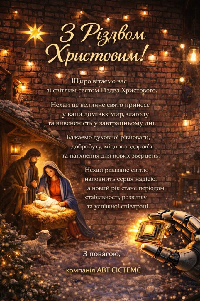 Команда ТОВ “АВТ СІСТЕМС” щиро вітає Вас зі світлим святом Різдва Христового! Нехай це величне свято принесе у Ваші домівки мир, злагоду та впевненість у завтрашньому дні. Бажаємо духовної рівноваги, добробуту, міцного здоров’я та натхнення для нових звершень. Нехай різдвяне свято наповнить серця надією, а новий рік стане періодом стабільності, розвитку та успішної співпраці.